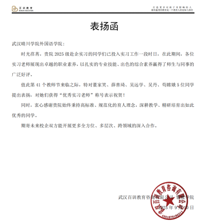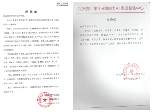 武汉百训教育咨询有限公司将“优秀实习老师”称号授予董家笑、薛善琦、吴远学等5名学生,表扬学子们良好的职业素养,并感谢学校“深耕教学、精研培育”的高标准育人模式。武汉优职幼教产业联盟特别表扬李诗琪、汪晴云、牟芊等19名实习老师,称赞他们以目标与信心克服迷茫,用行动诠释教师称谓的责任与使命,成为孩子们“人生路上的第一位老师”。武汉颐康仕AI家庭服务中心对徐思思、李丽君、叶青梅等6名实习生给予高度评价,认为他们“学习能力强、工作负责、协作良好”,高效完成各项教学任务,充分彰显学校育人成效。