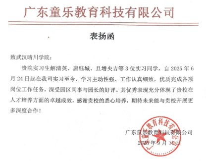 深圳智行千里科技公司为胡雪怡、戈贝贝、李紫怡等5名学生授予“优秀实习老师”称号,肯定其扎实的技能、过硬的本领,并点赞学校对教师培养的育人理念。北京京师智雅教育科技有限公司相关园所 在感谢信中提到,该校学前教育专业实习生“吃苦耐劳、基本功扎实、团结同事”,期待学校持续推荐优秀学子,双方共同为学子搭建绽放青春、展现自我的平台。广东童乐教育科技有限公司则表扬解清英、唐钰城、旦增央吉3名实习同学学习主动性强、工作认真细致,认为其优秀表现是学校人才培养卓越成效的直接体现。