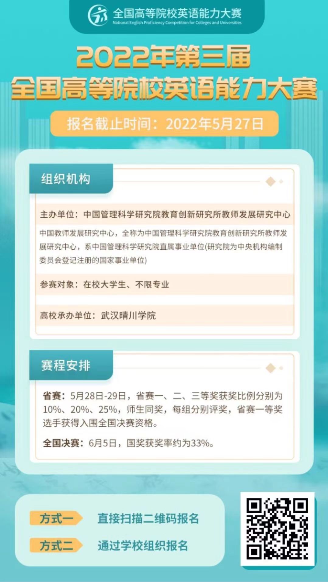 为深入贯彻教育部《国家教育事业发展“十三五”规划》,落实高等院校英语教学改革精神,顺应“一带一路”发展的新形势,满足国家对人才培养的要求,引导学生在英语学习过程中思维能力的培养,帮助学生进行英语能力的自我诊断,发现优势和不足,有针对性的设定学习目标,提高人才培养质量。经学院研究,决定举办2022年全国高等院校英语能力大赛,现将有关事宜通知如下: