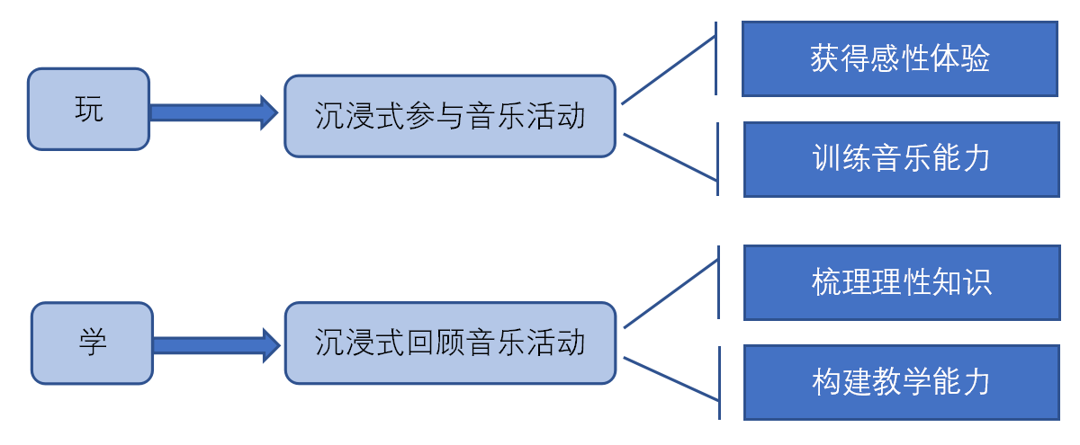 “先玩”-“后学”的设计思路在于,将“训练学生自身音乐基础与音乐能力”,与“提高音乐教育教学技能”同时兼顾,同步进行。