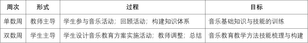 该课程的授课形式是,分为单/双周形式进行。在单周学时教师主导,学生在教师的引导中,通过体验音乐活动进行相关知识的学习与梳理;在双周学时转由学生主导,学生根据教师的任务设置,来完成相应的音乐教育方案的设计与实施,最后教师根据学生的方案设计与实施情况对学生的设计进行调整、补充与总结。在这一过程中实现“音乐基础知识与技能的训练”与“音乐教育教学方法技能梳理与构建”的双重目标。