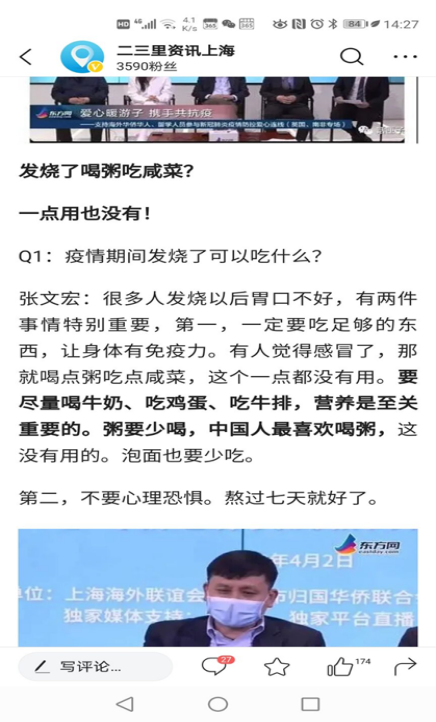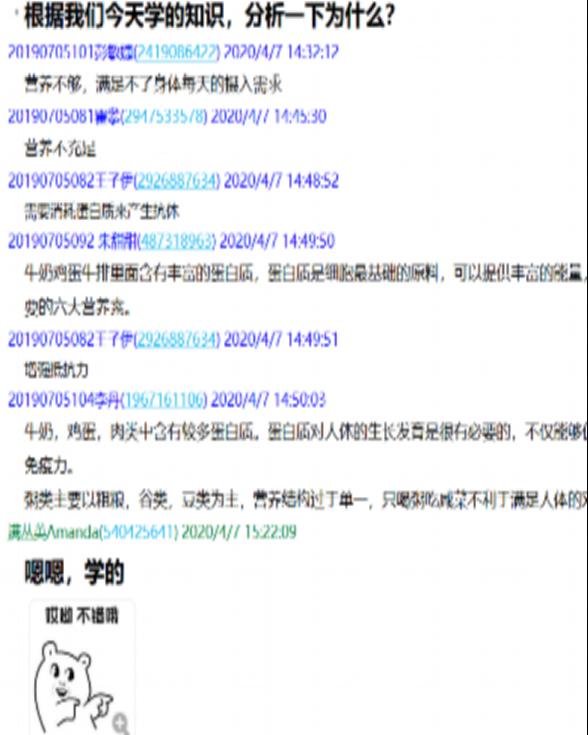课中反馈:这个是整个教学效果保证的主体和关键。上课时,通过QQ直播教学(图4),讲解相应的知识内容,突出重难点,穿插播放短视频,保证课堂的活跃气氛;与学生互动,不定时提问点名回答问题,其目的是掌握学生的学习情况并刺激学生在线听讲的兴奋性;还会结合疫情相关主题开展相关讨论活动,如结合张文宏医生“疫情期间发烧了可以吃什么”(图5),讨论营养素的作用。