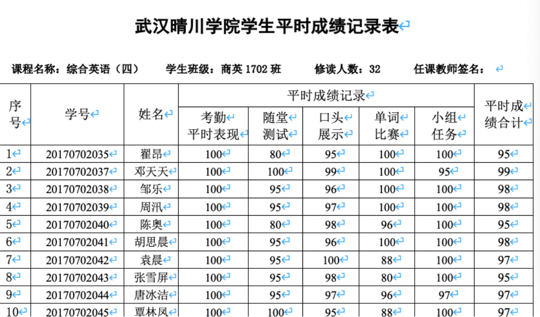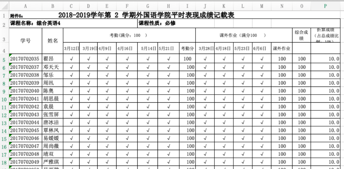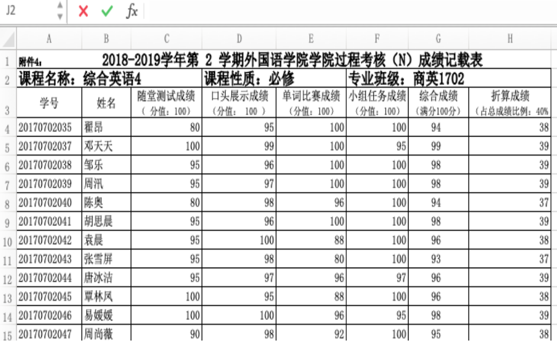 随堂测验,选取专四内容进行测验(满分100分),重点考察学生课下学习和完成布置任务的程度。