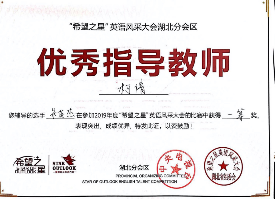 (2)朱英杰获得湖北省希望之星演讲比赛决赛省级一等奖