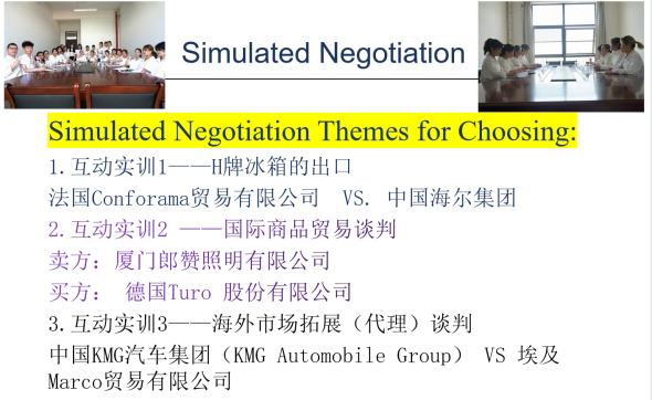 《国际商务谈判》是高等教育商务英语专业的一门专业必修课,是一门理论和实践密切结合的学科,具有知识面广、实践性、系统性强的特点。目前我院已开设3期,课程先后选用了由宋格兰主编、高等教育出版社出版的《国际商务谈判》和由刘白玉主编、中国人民大学出版社出版的《国际商务谈判》作为教材。教学内容结合“亿学软件国际商务谈判实训平台”进行了知识的重构和重组,整体教学过程融“教、学、做、考、赛”于一体,紧扣国际商务谈判所需的知识与技能,特别注重学生谈判能力的培养,同时引导学生树立正确的商务谈判意识与理念,塑造正确的国际商务谈判价值观,使他们成为具备开阔的全球视野、多元的跨文化交际能力、正直的双赢思维以及全球使命感的优秀的国际商务人才。