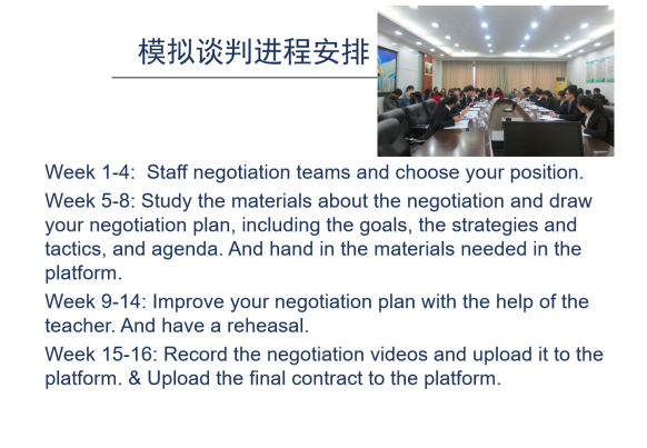 明线1:国际商务谈判理论的系统讲解与强化。关于国际商务谈判的认知部分,教师整合课本内容,帮助学生梳理国际商务谈判的定义、性质特点;国际商务谈判的基本原则;国际商务谈判准备阶段的团队组建;国际商务谈判准备阶段的信息收集、计划制定、议程设置等;国际商务谈判的开局阶段、磋商阶段、结束阶段等各个阶段的谈判策略和技巧;国际商务谈判的不同类型;国际商务谈判中的语言及非语言交流技巧;文化因素对国际商务谈判的影响等。为加深学生对于理论的理解,教师在梳理理论的同时融入具体的谈判案例。