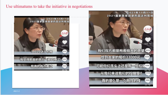 课前段学生积极准备个人展示的内容,展示内容为商务谈判名人故事、谈判经典理论或经典谈判案例分析等。于这些谈判名人故事、经典谈判案例中师生都收获了很多,有关于周恩来总理的机敏睿智的谈判案例,有关于外交家顾维钧先生的“国家利益高于一切”的谈判片段,有关于国家医保局的“灵魂谈判”的案例……在潜移默化中,学生领会了优秀谈判者的素养与品质。