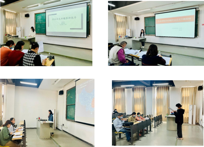 本次2023届开题报告答辩严格采用指导教师回避制,为保证评委意见一致,平均每组答辩组有3名答辩评委。在答辩教室内现场秩序井然,首先,答辩老师首先向同学们强调答辩的注意事项,同学们抽签决定答辩的顺序。答辩过程分为现场陈述、教师提问、学生答辩及成绩评定3个环节,成绩评定决定学生开题是否通过开题。其次,在答辩中,同学们要对论文的选题、研究思路和技术路线等进行说明,再根据开题报告分章节进行阐述,学生答辩总体态度认真,面对答辩评委提出的问题,思路清晰,能准确地进行了作答,虚心接受答辩评委提出修改意见。而答辩老师以认真、严谨的态度,考察学生对于专业知识的掌握程度,根据学生各自的开题报告和答辩内容提出有针对性的修改意见并反馈给指导老师,共同指导学生提升其论文质量,也让学生对自己的选题也有了更加深入的理解,而对研究方向不明确,选题内容冗杂和论文思路不清晰等严重问题的开题报告会给予不通过。