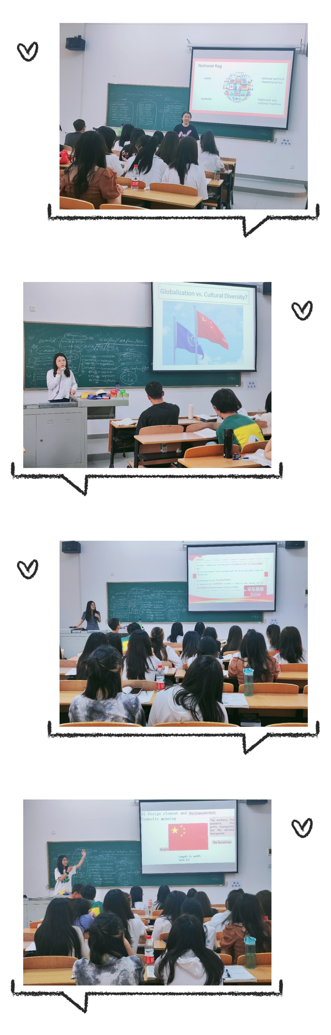 本次公开示范课的教学目标主要包括语言层面、能力层面、文化层面和思政教育,重点突出英语教学过程中的思政教育。在上课的第一阶段以作业检查的形式讲授了名词后缀构词的相关规则,并通过课后相关练习进一步巩固后缀构词法的使用。然后,针对文章的内容补充了相关的文化背景知识,如美国独立日的由来、美国国旗的象征意义、美国革命、法国大革命以及启蒙运动等,以文章为基础,深入了解语言背后承载的文化意义和内涵。在了解西方相关历史和文化的基础上,以分组讨论的形式邀请不同学生解读五星红旗和国庆节承载的文化意义和历史故事,不忘革命先烈建立新中国的艰难岁月,充分理解中国共产党的领导地位和作用,在信息搜索和处理的过程中,坚定学生爱国爱党的信念。最后,师生还在课堂中讨论了侨民们如何在异国文化语境中针对子女们开展爱国教育以及中华民族如何在全球化进程中保持自己的民族特色等话题。