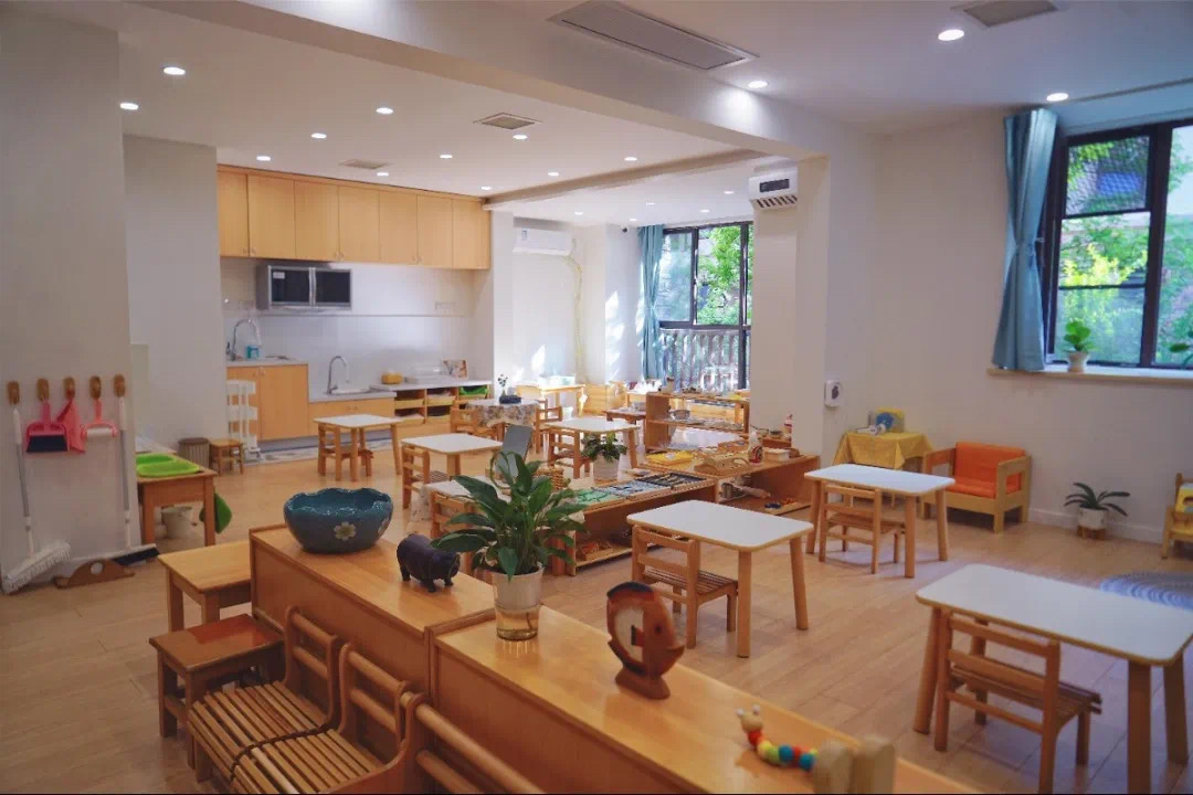 一楼的园区的数间教室包括儿童厨房和绘本馆。其中儿童厨房的餐具大部分来自真实生活中使用的餐具,这样能帮助孩子获取和精致化动作的技能;绘本馆则提供语言学习的环境和享受阅读乐趣的空间。