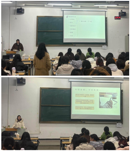 随后,会议邀请了两位优秀学姐代表进行经验分享。李湖川同学结合自身备考经历,详细分享了英语专业四级考试的复习要点与时间规划。王丹同学则从宏观角度出发,为在场同学梳理了一份实用的英专生学习指南。她们的分享内容丰富,贴近学习实际,为学弟学妹们提供了宝贵的参考。