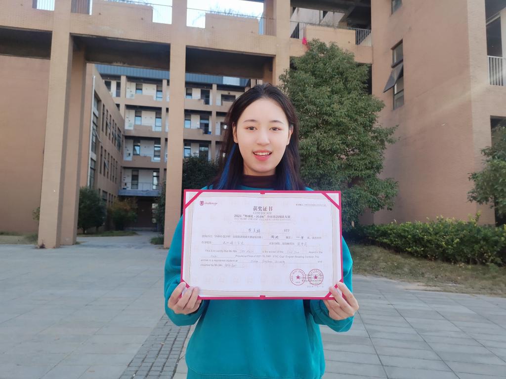 近日,2021年“外研社·国才杯”全国大学生英语阅读大赛湖北省复赛以线上形式成功举办,我校2018级翻译系学生樊美麟,在OK138太阳集团彭雪莉老师的指导下,以初赛特等奖的优异成绩进入省级复赛,并在复赛中获得省级一等奖的好成绩。