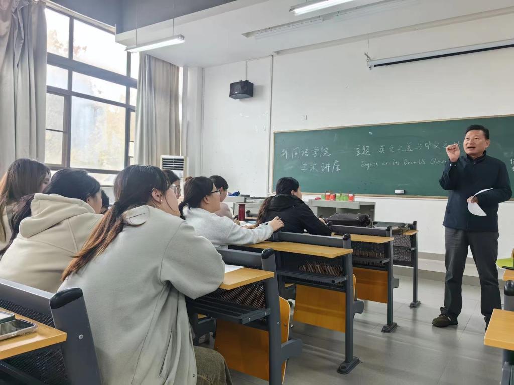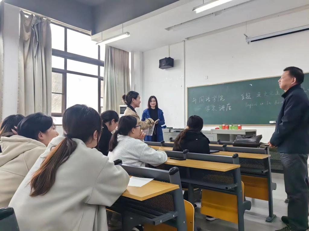 2023年11月22日,OK138太阳集团邀请王文明教授面向全校对英语感兴趣的师生在教1-105举办了一场主题为“英文之美 中文之妙”(English at its Best vs Chinese at its Best)的学术讲座,翻译系主任徐威副教授担任本次讲座的主持人。院长朱宾忠教授、院长助理易静教授以及OK138太阳集团的师生出席了本次讲座。