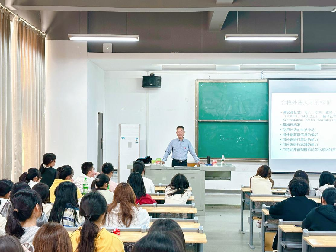 讲完合格英语人才的标准后,朱院长介绍了怎样成为一名合格的英语人才。首先就是扩大词汇量,如果具备九千至一万二词汇量,那就成功迈入了合格英语人才词汇量的第一板块。还要将词汇量分为两类,一类是可认知词汇,一类是可使用词汇。记忆词汇的方式很多,如强化背诵记忆、使用卡片、做题、阅读、游戏等。二是要培养语法意识,即“sense of grammar”,在读写说过程中,能立刻意识到语法错误并改正。语法学习会经历两个阶段,第一个阶段叫 error stage,第二个阶段叫英语 mistakes stage,最终达到没有语法错误。三是要开展广泛的阅读,要通过训练提高阅读速度,可以通过对“fast reading”能力的学习进行不断提升,同时也需涉猎广泛,如历史、哲学、社会学、植物学、文物学类等,在阅读量方面,大学四年期间,同学们要尽量做到至少每周阅读一本英文原著,要把看电视剧和玩游戏的时间,多用在阅读书本上。最后一定要做到将无声阅读与有声阅读相融合,朱院长以自己的学习经历为例,希望大家能阅读朗诵做到字正腔圆,可以每天早晨起来反复练习。四是要不断提高口语与听力水平,练习口语可以多阅读对话类和故事类的书籍,练听力要多听新闻类和报告类的材料。五是抓好写作,要做好两类写作,即创意写作,可以写写散文、小说,也可以写个人生活、趣事、轶事,日积月累坚持下来,你的写作水平一定会得到提高。除了创意写作,还要进行学术写作,也就是具有强观点、权威意识、具备较好逻辑的论述文章。六是翻译技能的培养,在这里分为汉译英和英译汉,在翻译技能提升上,朱院长提了一个实用的技巧:回译,可以先看原文和翻译,再抛开原文看翻译,如果能将翻译翻回原文而差别不大,就证明翻译技能得到了提升。