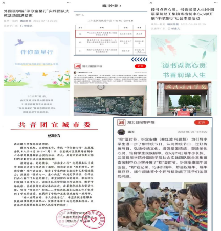 本次暑期实践在大学官方媒体跟踪报道3次;湖北日报客户端报料2次;2023年7月中旬收到来自共青团宜城团委的感谢信;带队指导老师满丛英在“大我青春”2023暑期社会实践成果征集活动中撰写的《“三主体三思维”助推暑期乡村教育的生命自觉》获评教育部“中国大学在线”工作案例类优秀作品。