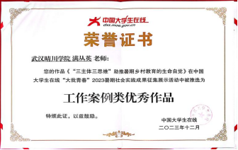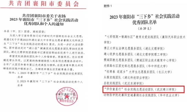 近日,共青团襄阳市委开展了2023年襄阳市“三下乡”社会实践活动表彰名单出炉,我院的“伴你童星行”实践团队荣获社会实践活动优秀团队。