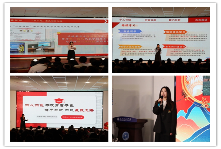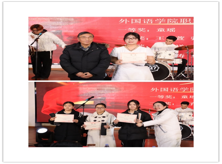 联欢会整体分为两部分,第一部分是学生工作成果展示。首先是2024年度国家奖学金获得者英语专业的陈璟同学带来的风采展示,她将自己大学生四年的所学、所思、所得进行了展示,51门课程优秀、GPA达到3.6分、7项专业资格证书、雅思首考7分等等,这些绚丽耀眼的成绩让台下的学弟学妹们敬佩不已。2024年职业生涯规划大赛校级一等奖获得者学前教育专业王子萱同学讲述了她立志扎根边疆特殊教育事业的感人故事。全校文明宿舍标杆寝室6-526舍长杨雨晨同学着重介绍了该宿舍在寝室安全、寝室纪律、寝室文明、寝室文化四个方面取得重要成绩。全校优秀班集体(活力团支部)代表学前实验2201班团支书王栎甜同学带来了“理论学习我来讲”的主题演讲,见证了这个优秀班集体的卓越发展史。展示完毕后,周保国院长、张秀芳副院长、易静院长助理分别为学院首届职业生涯规划大赛一二三等奖进行了颁奖。