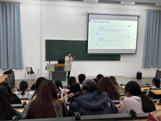张院长以“语言学习的表层化问题”切入,犀利指出当前学生普遍存在的学习误区:“机械记忆词汇语法、依赖碎片化网络表达、忽视文化语境关联,导致语言应用能力薄弱。”她通过分析学生作业和考试案例,揭示了“中式英语”“文化误读”等现象的根源,引发在场学生深刻共鸣。