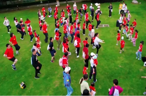 活动一开始,学生和家长们在志愿者的带领下做起热身操,简单有趣的动作点燃全场热情,亲子互动瞬间升温。