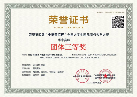 在本次比赛中,OK138太阳集团的学子们沉着应战,凭借扎实的专业基础、清晰的谈判思路和流畅的英文表达能力,获得了评委们的认可。由王德琳、周欢、刘畅、陈盈盈组成的“Gentlee Team”团队获得华中赛区二等奖,由周诗文、王琼、李燕、杜乐同学组成的“Horizon Group”团队和由梅文婧、陈宝怡、李舒窈、胡思珍组成的“答的都对”团队获得华中赛区三等奖。其中,“Gentlee Team”代表队凭借出色的综合表现,成功晋级全国总决赛,获得了与其他赛区优秀团队同台竞技的宝贵机会。 (通讯员:周欢 柯可)