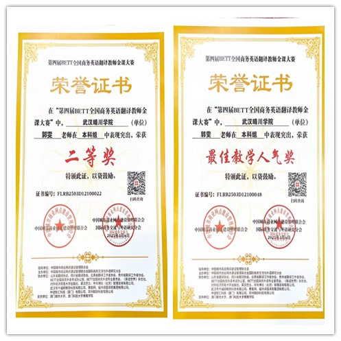 同年,在国内商务英语翻译教育领域的顶级赛事——第四届BETT全国商务英语翻译教师金课大赛中,郭雯老师一路过关斩将获评本科组二等奖,并斩获"全国十佳人气奖"。两项国家级大奖的背后,是她对教学细节的极致追求:备赛期间她反复打磨教学方案,融合翻译理论与行业实践,主动汲取前辈经验,将复杂知识点转化为生动易懂的教学内容,形成了兼具严谨性与趣味性的教学风格,最终以扎实的专业功底和创新的教学设计赢得评委与同行的双重认可。