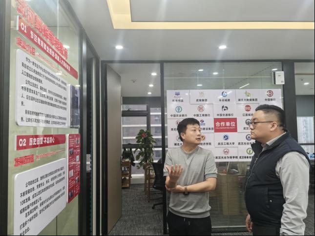 在易择前程教育CEO徐天垠及相关负责人的陪同下,刘书记一行参观了该公司的办公环境、文化展厅及项目运营中心。徐天垠详细介绍了公司的发展历程、业务板块及未来战略布局。据介绍,该公司依托与北京市保安服务有限公司(国有一级企业)及湖北万研文旅实践教育基地的深度合作,形成了“招考在易择、实训在基地、就业在国企”的一体化闭环链条,为学员提供了从报考到入职的“一站式”服务。