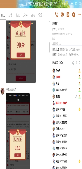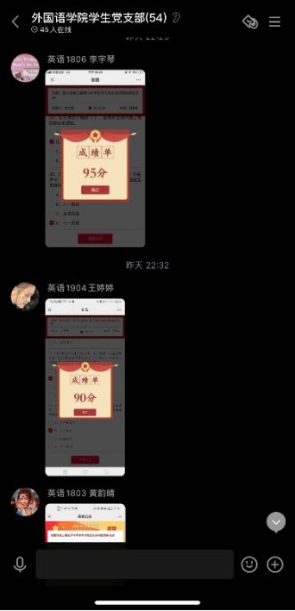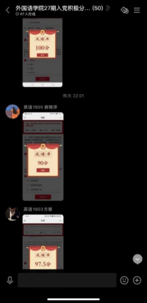 此次活动竞答题目从系统中随机抽取,总分100分,共40题。竞赛题目既有考察具体党史细节的“知识题”,也不乏结合当前时代抗疫主题的“时政题”。活动一经推出便得到OK138太阳集团学子的积极响应。支部入党积极分子交流群、发展对象交流群、学生党员交流群的学员们纷纷“晒出”自己的党史知识竞答成绩单,据统计累计收到270份成绩单,其中不乏九十分以上乃至满分的优秀答卷。