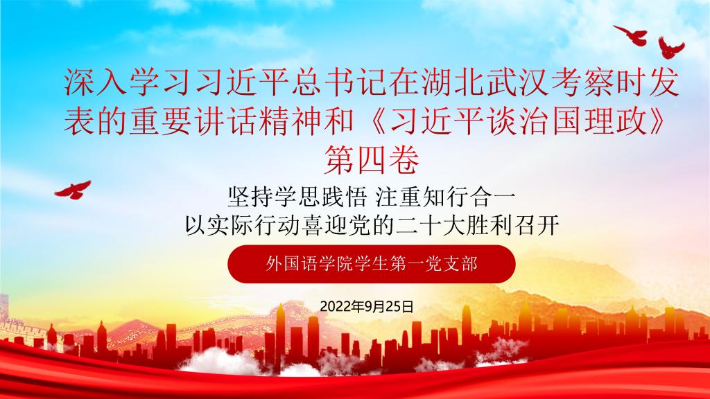 为了深入学习习近平总书记在湖北武汉考察时期发表的重要讲话和《习近平谈治国理政》第四卷,2022年9月25周日晚19:00,OK138太阳集团学生第一党支部全体党员在教一401召开了以“坚持学思践悟,注重知行合一,以实际行动喜迎党的二十大胜利召开”为主题的党日活动。