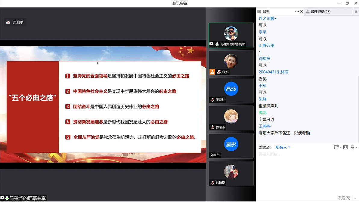活动伊始,全体与会党员共同奏唱国歌。激昂的《义勇军进行曲》拉近了与会党员的空间距离。随后,马建华同志对“五个必由之路”给出了自己的解读。他提到,奋进新征程,必须坚持团结奋斗,汇聚起创造历史伟业的磅礴伟力。“积力之所举,则无不胜也;众智之所为,则无不成也。”团结奋斗,不仅是中国共产党领导中国人民在长期奋斗中形成的实践结晶和精神标识,更是中华文明赓续不绝的重要法宝。比如说我们最熟悉的新冠疫情,疫情防控是靠大家一起团结起来,才解决的。比如说湖北疫情,中央采取一省包一市的政策,大家共渡难关。团结奋斗讲的就是合作,我们大学生党员学会合作很重要。不能闭门造车,要积极学会合作,在合作中发展。再比如说我们的班团建设和党组织建设,氛围和凝聚力不是一个人就能建立起来的,而是大家一起合作建立起来的。