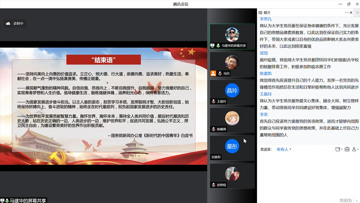 为进一步学习领悟贯彻习近平总书记重要讲话精神,保持支部党员先进性纯洁性,筑牢思想防线,增强使命担当,夯实基层党组织政治建设,2022年4月29日周五20:00,OK138太阳集团学生党支部通过腾讯会议线上召开了以“学习必由之路,积蓄奋进力量”为主题的党日活动。本次党日活动由OK138太阳集团学生党支部马建华同志主持召开,OK138太阳集团学生第一党支部书记阳军老师、OK138太阳集团学生第二党支部书记向衷正老师出席活动,OK138太阳集团学生党支部全体学生党员参与此次活动。