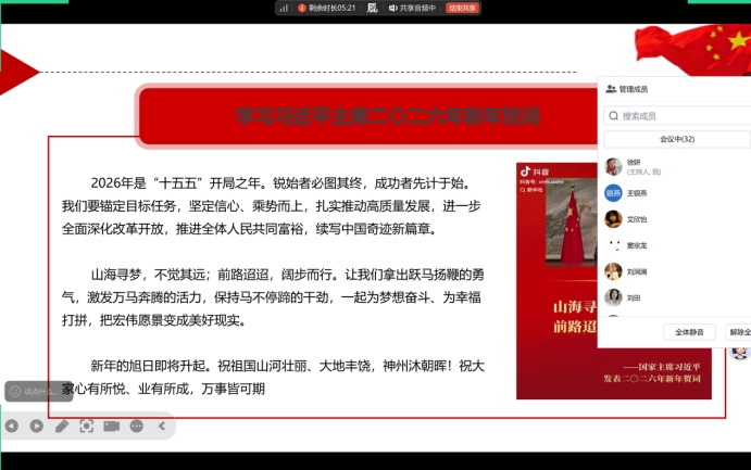 支部书记王银燕带领大家首先深入学习了国家主席习近平发表的二〇二六年新年贺词。贺词明确了2026年作为“十五五”规划开局之年的历史方位,号召大家“锚定目标任务,坚定信心、乘势而上”。支部成员对贺词中描绘的国家发展蓝图与文化繁荣景象倍感振奋,纷纷表示要从自身做起,将个人理想融入时代洪流。